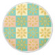 A seamless pattern with geometric floral motifs in yellow, pink, and teal on pastel squares, creating a vintage, harmonious, and cheerful design.