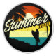 Diseño de estilo retro con "vibraciones de verano" texto con atardecer tropical y silueta de surfista femenina
