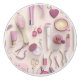 Un arreglo de los rosado-salmones de los artículos que se pueden encontrar en una tabla de la vanidad; como cepillo, bate, cámara, perfume, joyería, cepillos y así sucesivamente.