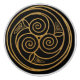 Dramático negro y oro intrincado triple nudo celta gire mandala. Espirales eternas y nudos de trinidad adornan un antiguo pergamino