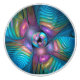 Una imagen fractal multicolor y giratoria que se asemeja a las alas texturadas que rodean una esfera central. La imagen fractal se repite en miniatura en la esfera.