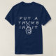 Esta camisa graciosa tiene muchos significados. Put A Thumb In It se inspiró en un oficial de policía que tuvo que salvar la vida de alguien usando su pulgar para detener la hemorragia y también una historia acerca de cómo detener a un perro que ataca. Podría significar que se le sube el dedo. Usa tu imaginación. Esta camisa tiene la "U" destrozada en el pulgar de la palabra.