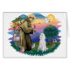 El santo patrono de los animales y las figuras queridas que cruzan las líneas denominacionales, San Francisco se muestra aquí con un caniche estándar blanco. La figura del propio San Francisco fue adaptada de la obra maestra de Giotto del siglo XIV y Jean Fitzgerald creó un nuevo fondo