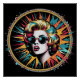 Un vibrante diseño de arte pop presenta a una mujer de estilo retro que usa gafas de sol, rodeada por una ráfaga de coloridas líneas de estilo cómico. El uso audaz de cian, magenta y amarillo crea una composición dinámica y energética.