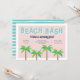 En verano, las invitaciones para asistir a una fiesta de cumpleaños en el pequeño bash de la playa incluyen cuatro ilustraciones verdes de palmeras en el fondo sobre un suave fondo rosa, con "beach bash" en la parte superior con letras retro. Personalice los detalles de su fiesta de cumpleaños utilizando la plantilla.