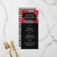 Menú boda negro y rojo con amapolas rojas contra rayas blancas y negras. Agregue el menú boda, los nombres y la fecha de boda.