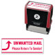 Este diseño de sello de goma incluye los mensajes "¡Por favor, regrese al remitente!" y "CORREO NO DESEADO", junto con un símbolo de flecha doblado. Podría utilizarse para indicar que el correo postal recibido se ha entregado a la dirección equivocada o a un destinatario desconocido, y debe devolverse al remitente.
