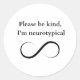 Añade un toque de atención y positividad a tu vida diaria con nuestro pegatina "Por favor sé amable, soy neurotípico". Este diseño reflexivo y significativo fomenta la compasión y el entendimiento, sirviendo como un recordatorio gentil para tratar a todos con amabilidad. Perfecto para laptops, laptops, botellas de agua y más, este pegatina es una manera simple pero poderosa de promover empatía e inclusividad.