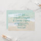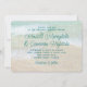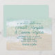 Invitación a bodas con novia y novio en la playa. Incluir los nombres completos de la pareja en un guión azul verde azulado. Elija actualizaciones de papel o descargue el diseño para imprimir el suyo propio.