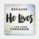 Guión de pincel moderno Duo con palabras en negro, "Porque vive, puedo enfrentar mañana". El diseño se basa en el fondo de papel texturizado vintage de ensueño.