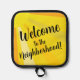 Bienvenidos a nuevos vecinos con una fuente de regalo con un alegre diseño de sol y un saludo de bienvenida al Barrio. Editar o agregar texto según sea necesario.