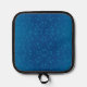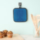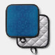 Blue potholder with a subtle dotted pattern and black trim on the front. The back is quilted silver, with the same black edging and a loop.