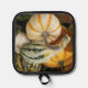 Manejar de forma segura bandejas de hornear, hojas de galletas y latas de muffin del horno con este portaobjetos con guarnecido negro que presenta una imagen de la vida residual de varios colores y variedades de calabazas y calabazas. Perfecto para la temporada de otoño, Halloween y el Día de Acción de Gracias. Seleccione el estilo de respaldo de su soporte de olla.