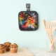 Una vibrante explosión de frutas frescas, incluyendo manzanas, fresas, plátanos y bayas, arregladas artísticamente en un dinámico patrón giratorio. Brillantes salpicaduras de colores (rojos, amarillos, verdes y azules) se entrelazan con los frutos, creando una composición dinámica y animada. El fondo es oscuro para realzar la vitalidad de los colores y el frescor de las frutas, que evocan una sensación de vitalidad y abundancia.