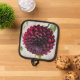 Manejar de forma segura bandejas de hornear, hojas de galletas y latas de muffin del horno con este portaplatos con guarnecido negro que muestra la imagen de una gran flor de Dahlia roja. ¡Un bonito diseño floral! Seleccione el estilo de respaldo de su soporte de olla.