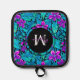 Bonito elegante patrón de flores moradas, azules, verde azuladas, turquesas y verdes y follaje personalizado de primer y último nombre de potholder. Hace un gran boda o un regalo de bienvenida.