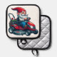 Un ilustracion caprichoso de un gnomo alegre que monta una cortadora de césped roja, con flores. El animado diseño presenta colores vivos y un ambiente lúdico.