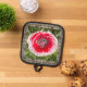 Trae un poco de belleza a tu cocina con un portaobjetos de arte que contiene una foto de una amapola roja y blanca rodeada por un borde hecho de los patrones únicos que se encuentran en la corteza de los árboles. Los tenedores de ollas hacen regalos cuidadosos para tu anfitrión o anfitriona favorita.