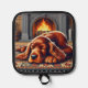 Un perrito irlandés Setter duerme tranquilamente sobre una alfombra estampada cerca de una gran chimenea, rodeado por un interior rústico y acogedor con un ambiente cálido y acogedor.
