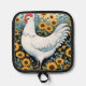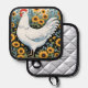 A white hen surrounded by bright yellow sunflowers, in folk art style, creates a beautiful country potholder. Perfect for anyone who loves chickens, gardens, and nature.