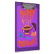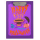 Ilustracion original de la taza de café de una bruja amante del gato de Halloween, varita mágica, poción, pequeños y lindos fantasmas, calabaza y murciélago volador con letras a mano diciendo Feliz Halloween. En colores vivos modernos y llamativos con ilustracion violeta y naranja para los niños.
