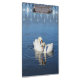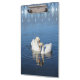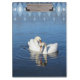 Este portapapeles muestra una fotografía de un par de cisnes mudos en un lago azul brillante.