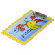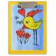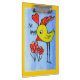Pintura de acrílico que muestra un pájaro amarillo de largas piernas con plumas rojas y un pico rojo mirando dos flores rojas. El fondo está pintado de azul claro. La pintura está enmarcada por un fondo amarillo, el mismo amarillo que en la parte posterior del portapapeles.