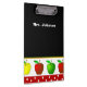 Elegante portapapeles de profesores, hecho en negro, con gráficos de una banda colorida, en el fondo, con manzanas y puntos de polka. Personalice el texto blanco, en la parte superior, para que se ajuste a sus necesidades.