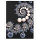 Espirales de marfil y perlas azules en una espiral sobre un fondo negro.