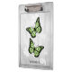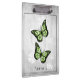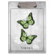 Apretar notas y recordatorios en una superficie segura con un Portapapeles personalizado de la flor de mariposa verde. El diseño del portapapeles presenta un par de mariposas vibrantes que descansan sobre una vina floral blanca contra un fondo gris claro. Artículos de regalo adicionales disponibles con este diseño así como una variedad de colores.