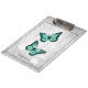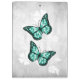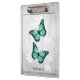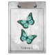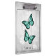 Apretar notas y recordatorios en una superficie segura con un Verde azulado Portapapeles personalizado de la flor de mariposa. El diseño del portapapeles presenta un par de mariposas vibrantes que descansan sobre una vina floral blanca contra un fondo gris claro. Artículos de regalo adicionales disponibles con este diseño así como una variedad de colores.