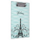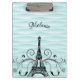 Este Verde azulado Portapapeles Floreciente de la Torre Eiffel presenta un diseño de la Torre Eiffel adornada con elegantes florecientes en un verde azulado fondo ondulado. Colores adicionales disponibles con este diseño también. Este artículo puede ser personalizado con un nombre, un monograma o un dicho favorito de su elección. Por favor, contáctame si necesitas ayuda con la personalización.