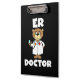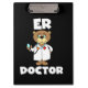 Un lindo portapapeles de diseño de médico de emergencias que cualquier médico de sala de emergencias seguramente amará, incluye un médico de oso de peluche con bata de laboratorio y estetoscopio y texto blanco que lee Médico de ER en un fondo negro.