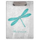Agarra notas y recordatorios en una superficie segura con un portapapeles personalizado Verde azulado de la libélula. El diseño del portapapeles presenta una libélula colorida, una vina suave de hojas blancas contra un fondo de damasco gris claro con un área para personalizar con tu nombre. Artículos de regalo adicionales disponibles con este diseño así como una variedad de colores.