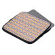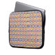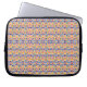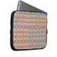 Una funda para laptop con un patrón geométrico intrincado y vibrante en amarillo, azul y rosa. El tono es colorido y animado, mejorando el accesorio tecnológico.