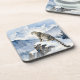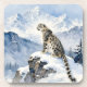A pretty wildlife coaster with an illustration of a majestic snow leopard perched on a craggy, snow-covered peak, gazing out at a vast, frozen mountain range.