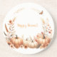 Elegante ilustracion acuático "Happy Harvest". Escena de otoño, muy bien arreglada, con una variedad de calabazas, rodeadas de delicadas flores silvestres en tonos suaves de amarillo y rosa. La composición incluye pastos delgados y acentos de hoja, creando un marco natural armonioso. Encima, una suave mariposa coquetea con gracia, añadiendo un toque de brillo al diseño sereno.