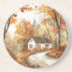 Esta montaña arenisca cuenta con una pintura acuarela de una pequeña casita de campo blanca rodeada de árboles en sus colores otoñales.
