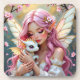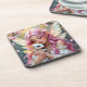 A pretty pink and gold anime elven fairy holding her cute white baby dragon coaster.