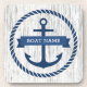 Astillas con un ancla náutica azul oscuro, rodeadas por un borde de cuerda sobre un fondo gris claro de madera de deriva. A lo largo del ancla hay una cinta azul con un campo de plantilla para el nombre del barco u otro texto personalizado.