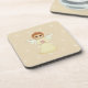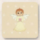 Cute little angel sosteniendo un corazón con copos de nieve en posavasos de fondo beige.