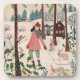 Mujer rosa y verde linda y conejos para el año del paisaje alpino de conejo de nieve en la naturaleza con nieve con árboles y casas. Obra original de Caroline Bonne Müller