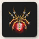 Araña mecánica, de vapor punk con oro, engranajes de latón y una lámpara de vidrio roja sobre un fondo negro. Estilo Steampunk.