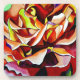 del diseño original de pintura acuarela del artista Sacha Grossel de la flor rosa "Alpine Sunset" de color multicolor en enfoque macro. El naranja, el amarillo y el marrón de este hermoso rosa y los coloridos y luminosos efectos del diseño floral sobre un fondo fresco y verde dan la impresión de una puesta de sol feroz a esta maravilla botánica.