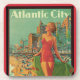 Ilustracion de época Estados Unidos de América, arte de afiches de viaje para Atlantic City, Nueva Jersey a través del ferrocarril de Pennsylvania, que incluye una hermosa mujer con un pin rubio en un traje de baño con una toalla mirando al sol en la playa durante el verano. La gente se está divirtiendo en la playa y en el paseo marítimo. Atlantic City es una ciudad turística conocida por sus juegos de azar, sus tiendas y su gastronomía.