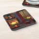 Un acogedor rincón de lectura en un día lluvioso de otoño. Alrededor de la chimenea hay unos sillones rojos mullidos, con pilas de libros y tartas y una tetera para completar el confort. En el exterior, un sauce amarillo y una cubierta roja de arce y hayas se ven oscurecidos por la lluvia que sopla la ventana, donde un gato jengibre se sienta mirando hacia afuera.