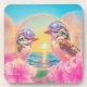 Una obra de arte vibrante y caprichosa, con dos elegantes gorriones con gafas de sol, contemplando una brillante puesta de sol sobre el océano. Rodeado de florecientes flores rosadas y de ondulados tonos pastel, esta escena tropical de inspiración retro irradia diversión de verano y encanto juguetón. Perfecto para los amantes de la playa, los aficionados a las aves y los amantes del arte colorido y agradable.