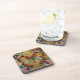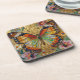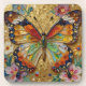 A pretty coaster with a front illustration of a beautiful gold, teal and orange butterfly surrounded by yellow, white and purple flowers. It's done with an impasto style and just emanates beauty and grace.