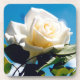 Rosa blanca bajo cielo azul. La vibrante foto de un hermoso rosa floreciente hace un gran regalo de arte floral en la pared. La belleza tranquila de la rosa blanca refleja nuevos comienzos, pureza, lealtad e inocencia. Las rosas blancas simbolizan el amor joven que la novia tiene por su cónyuge. Las rosas blancas también simbolizan el fundamento de una relación, razón por la cual a menudo se las ve en un día de boda. La rosa blanca es una flor boda tradicional. La rosa blanca es una flor apropiada para celebrar un nuevo vínculo romántico y marital.