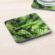 Una imagen de primer plano de helechos verdes primaverales iluminados por la luz desplegada a través del dosel forestal del bosque.